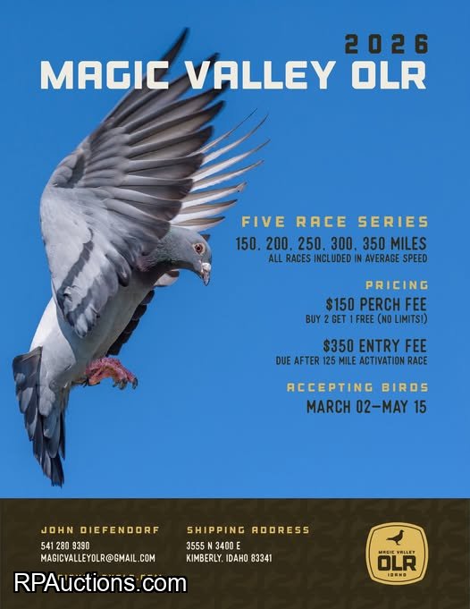 Welcome to Racing Pigeon Auctions! New users see 'User Instructions' at bottom. Click blue magnifying glass to see all listings!